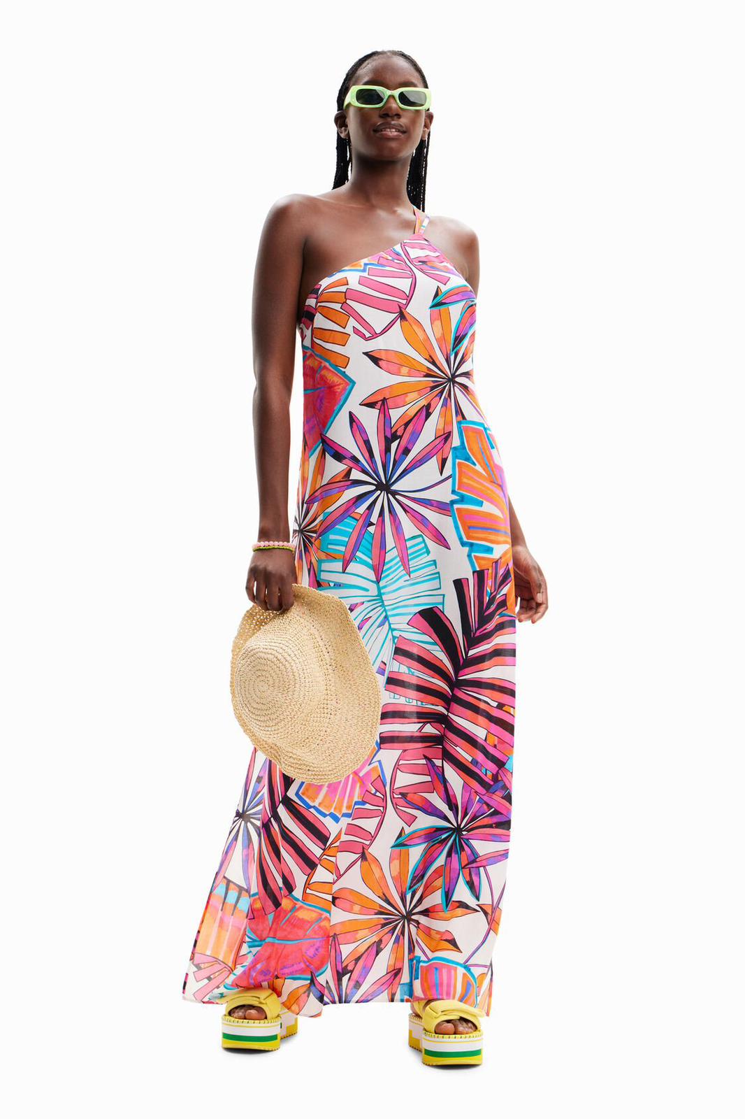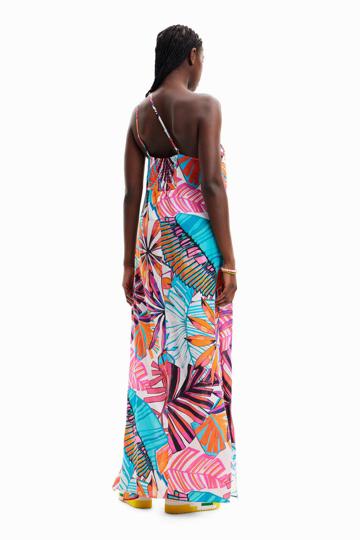 Abito Desigual, con scollo monospalla o halter, fondo bianco, multicolore. MATERIALE: 100% Viscosa.