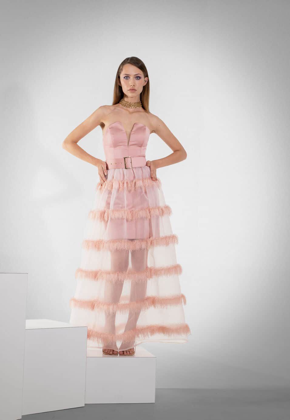 - Realizzata in tulle trasparente rosa cipria, è decorata da fasce orizzontali di piume tono su tono, che creano movimento e un effetto tridimensionale molto elegante.