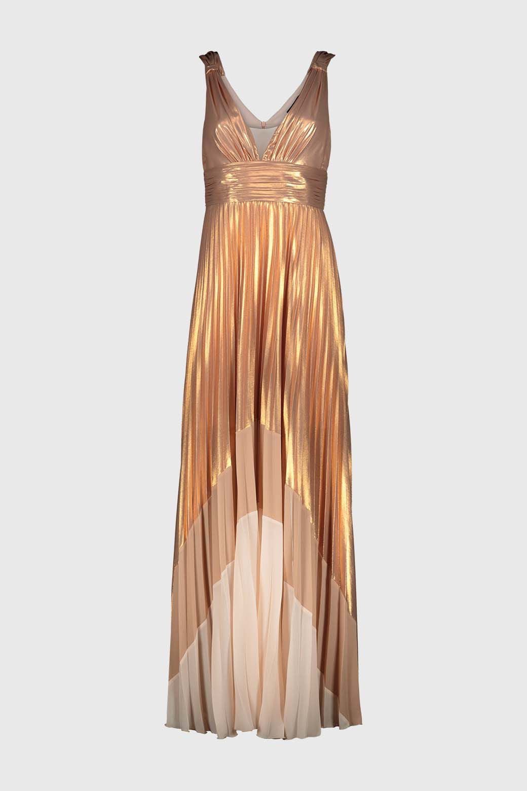 - Tessuto e lavorazione: la parte superiore e gran parte della gonna sono realizzate in un tessuto plissé metallizzato color oro-ramato, luminoso e scintillante. La parte inferiore, invece, è arricchita da un inserto di tessuto più leggero e opaco color nude/avorio, che crea un contrasto elegante e dona movimento grazie all’effetto trasparenza.