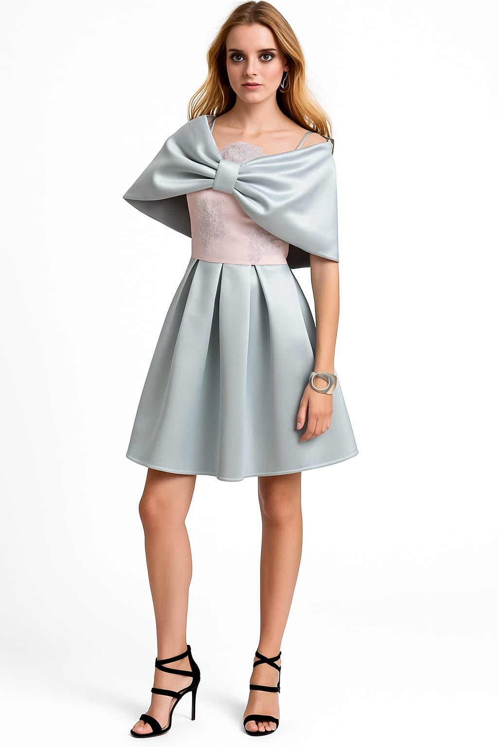 Bolero (opzionale): realizzato nello stesso tessuto satinato grigio perla della gonna, caratterizzato da un grande fiocco sul davanti che avvolge le spalle, donando un tocco sofisticato.