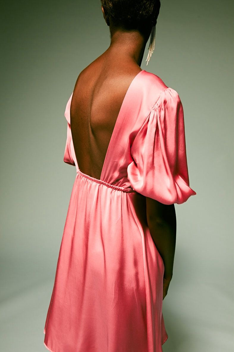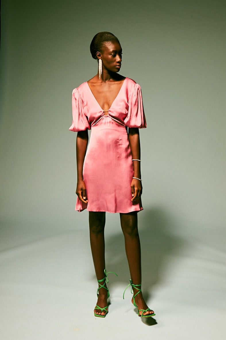 L’abito mostrato nelle foto è un elegante mini dress in raso rosa lucido, dal design raffinato e femminile.