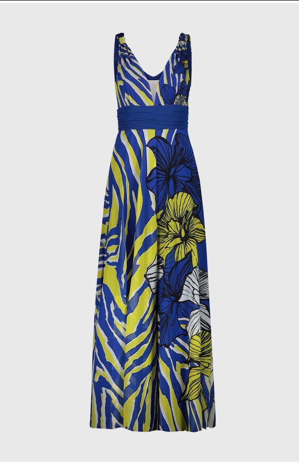 Abito lungo con fantasia floreale e scollo a V.