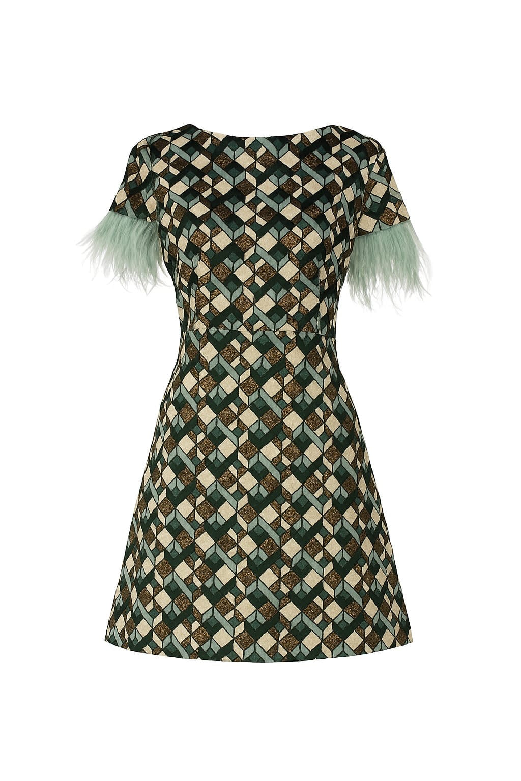 Realizzato in un tessuto jacquard con motivo geometrico a rombi nelle tonalità del verde, nero, oro e avorio, dona un effetto sofisticato e ricercato. Le maniche corte sono arricchite da morbide piume verde acqua che aggiungono un tocco originale e glamour al capo. Lo scollo rotondo e la struttura leggermente aderente in vita valorizzano la figura, rendendolo perfetto per occasioni speciali