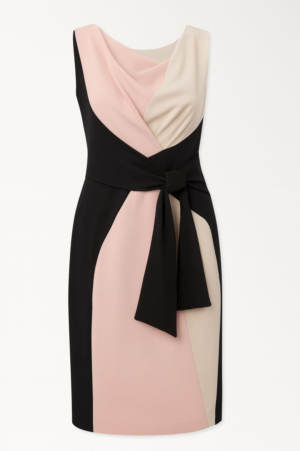 Abito smanicato dal design raffinato e moderno, caratterizzato da un elegante gioco di colori a blocchi nelle tonalità rosa cipria, avorio e nero. Lo scollo morbido drappeggiato dona femminilità, mentre la cintura annodata in tessuto nero segna delicatamente il punto vita, creando un effetto ottico snellente. La lunghezza al ginocchio e la linea leggermente svasata rendono questo modello perfetto sia per occasioni formali che per eventi speciali.