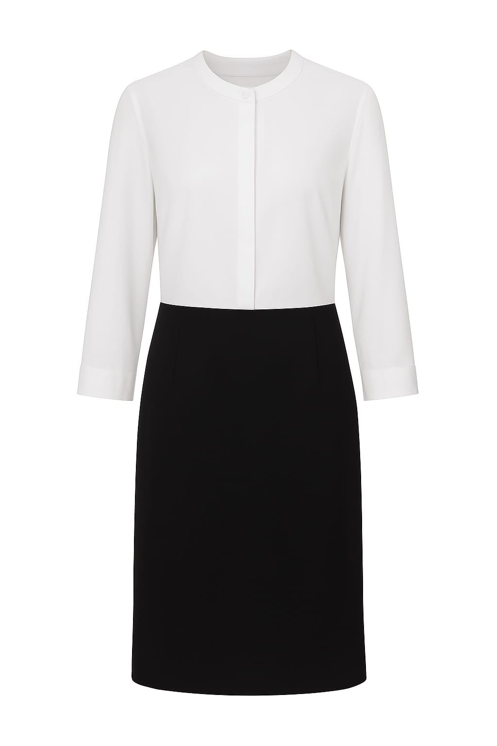 Eleganza e semplicità si incontrano in questo abito dallo stile intramontabile. La parte superiore, realizzata in morbido cotone bianco, presenta un taglio pulito con scollo rotondo e maniche a tre quarti, ideale per un look sobrio e raffinato. La parte inferiore, in tessuto nero, crea l’effetto di una gonna a tubino che valorizza la silhouette e dona un tocco sofisticato.