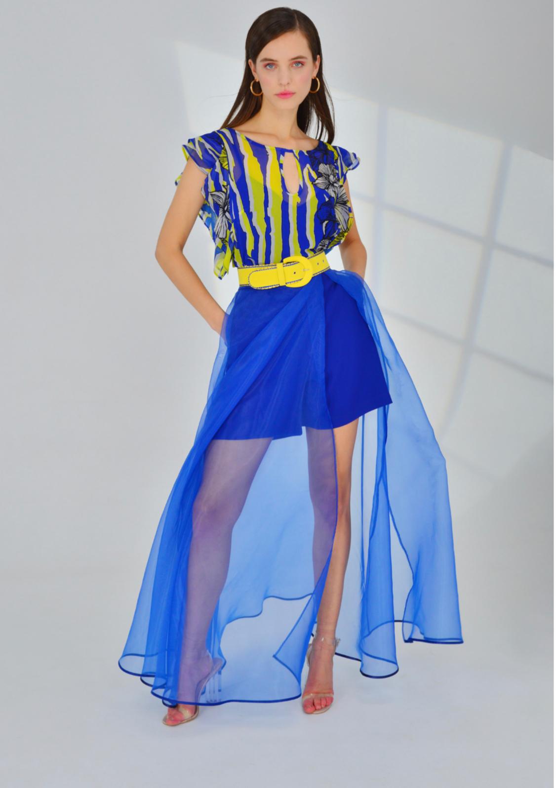 Blusa corta, con alette a rouches fino al punto vita. Fantasia floreale sul lato, nei colori blu, giallo, bianco e nero. Scollo a barca con goccia sul davanti. Dietro scollatura a V accompagnata da microrete nude. All’interno top a canotta per coprire trasparenza.