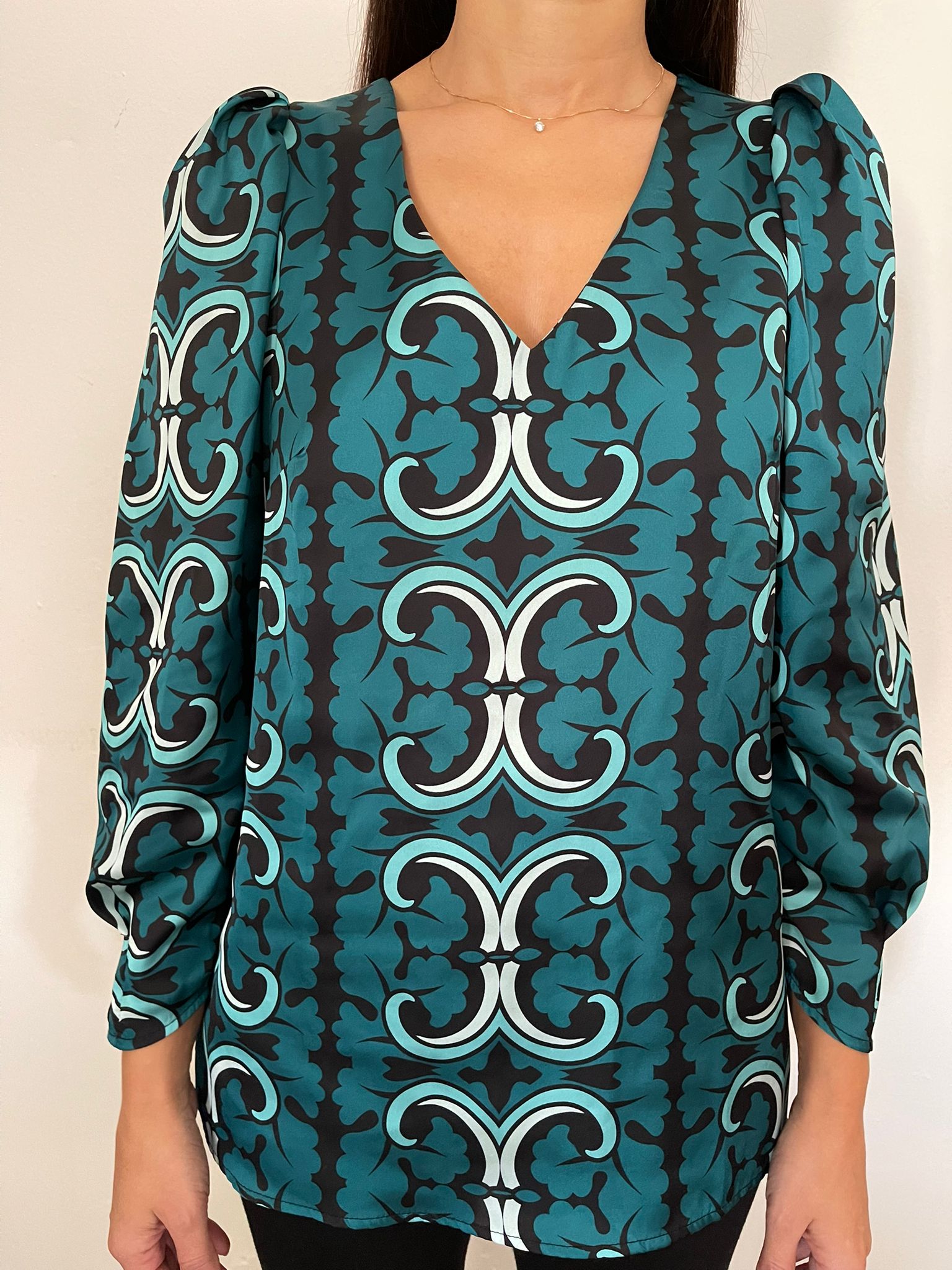 La blusa in foto è un capo elegante e di carattere, con un design che richiama motivi vintage ma dal tocco contemporaneo.