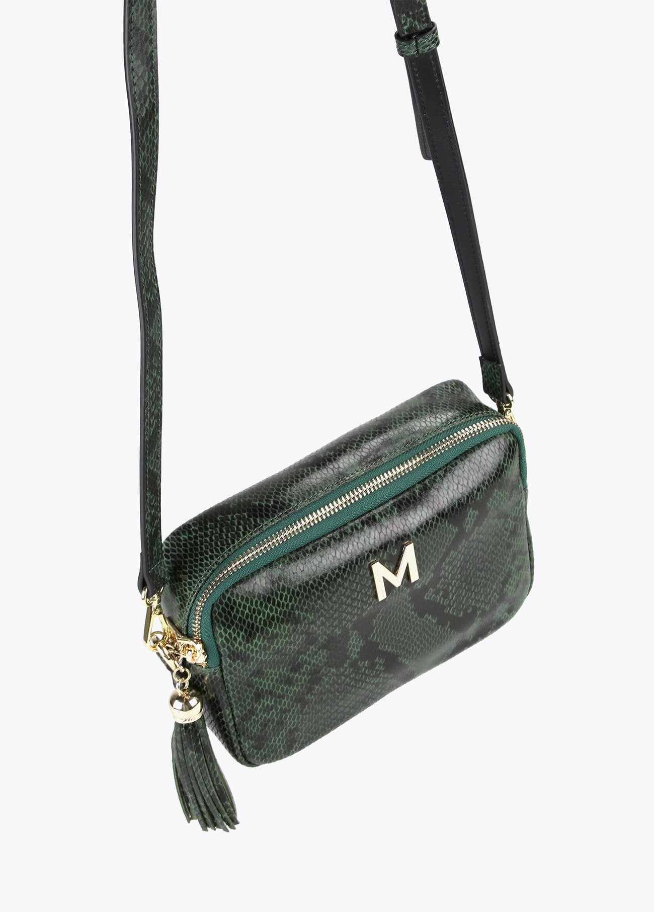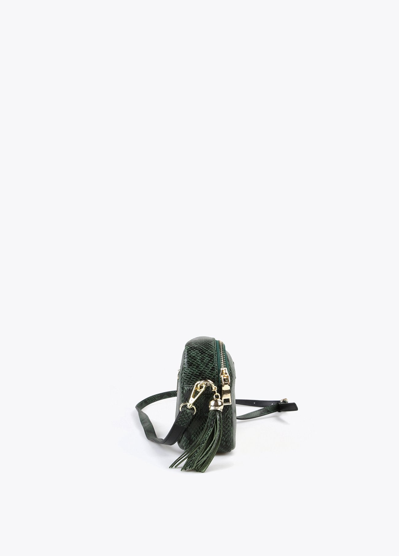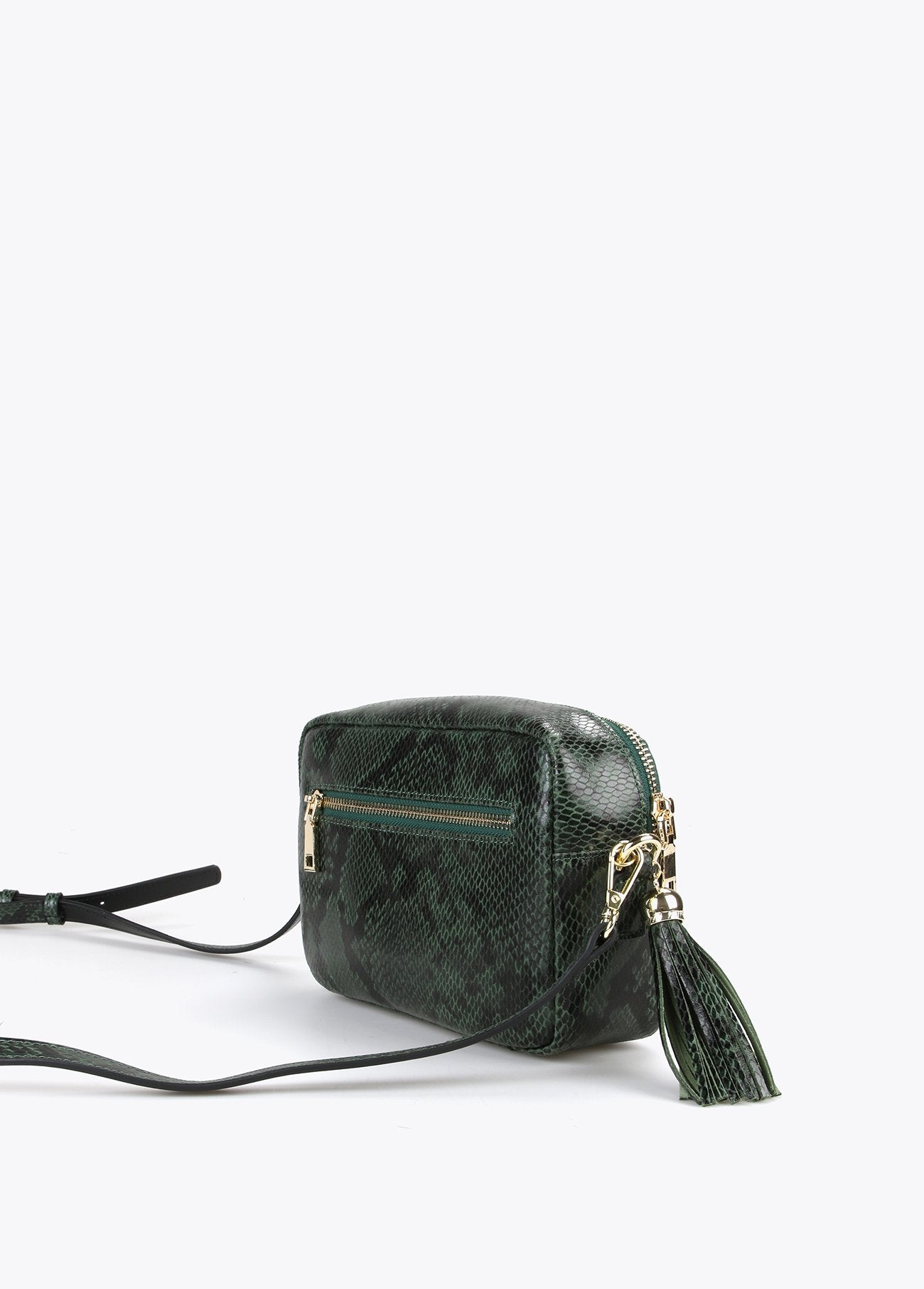 Borsa a tracolla con stampa effetto serpente e logo centrale dorato. Tracolla regolabile e rimovibile. Dettaglio di pompon come laccio da polso, tasca posteriore e chiusura centrale con cerniera.