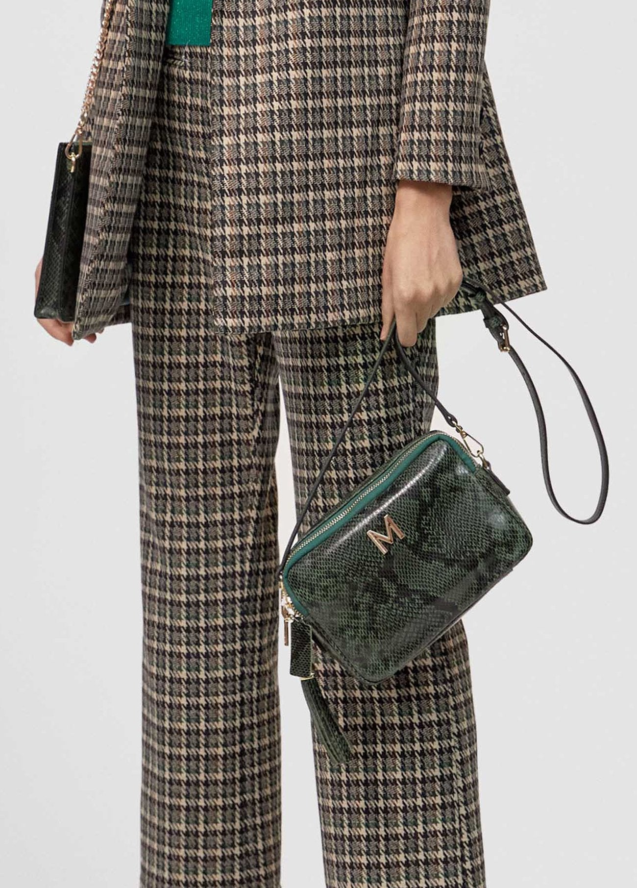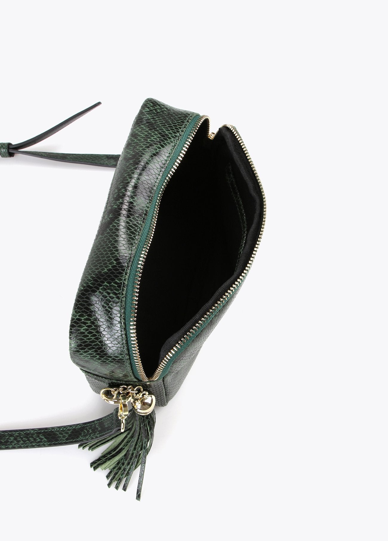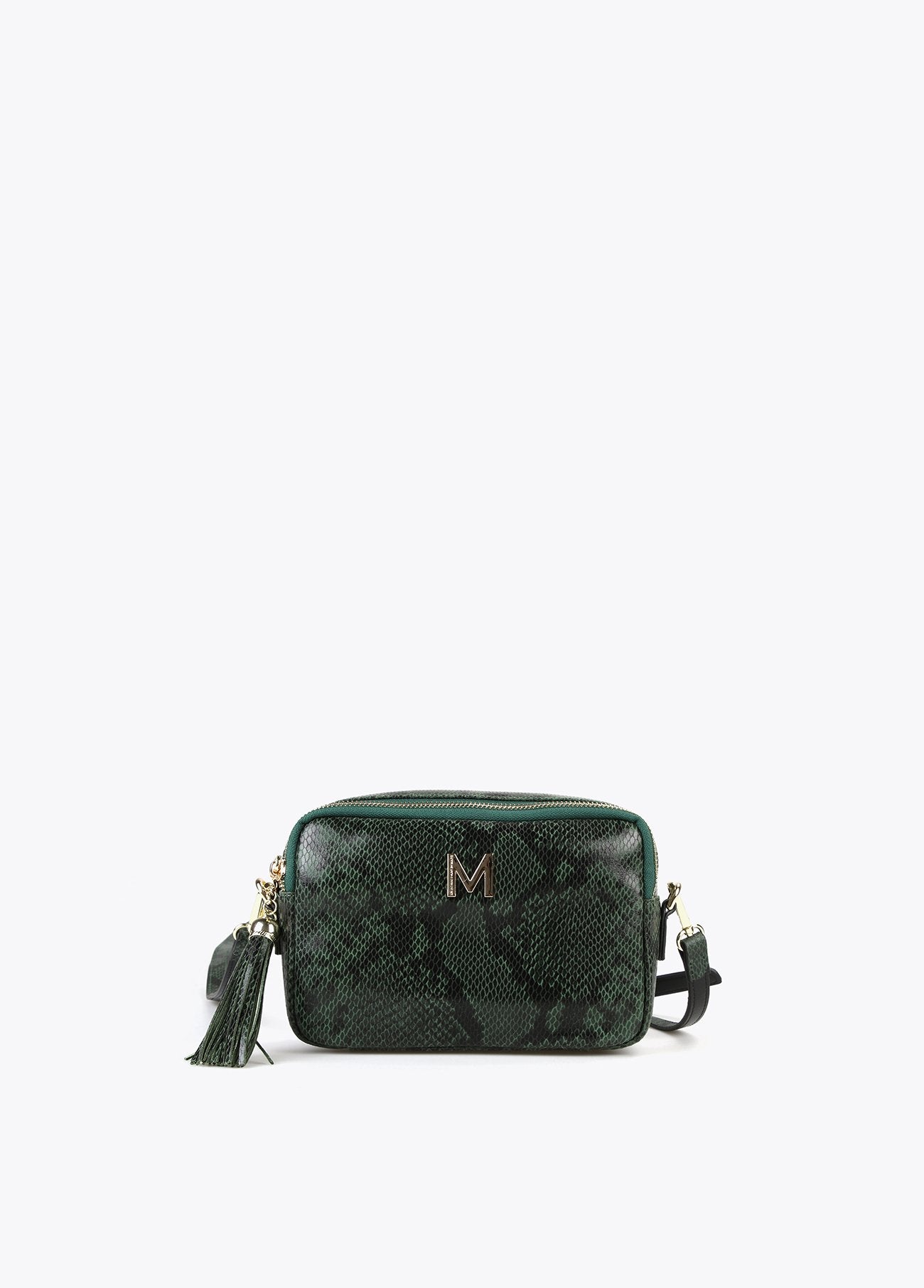 Borsa a tracolla con stampa effetto serpente e logo centrale dorato. Tracolla regolabile e rimovibile. Dettaglio di pompon come laccio da polso, tasca posteriore e chiusura centrale con cerniera.