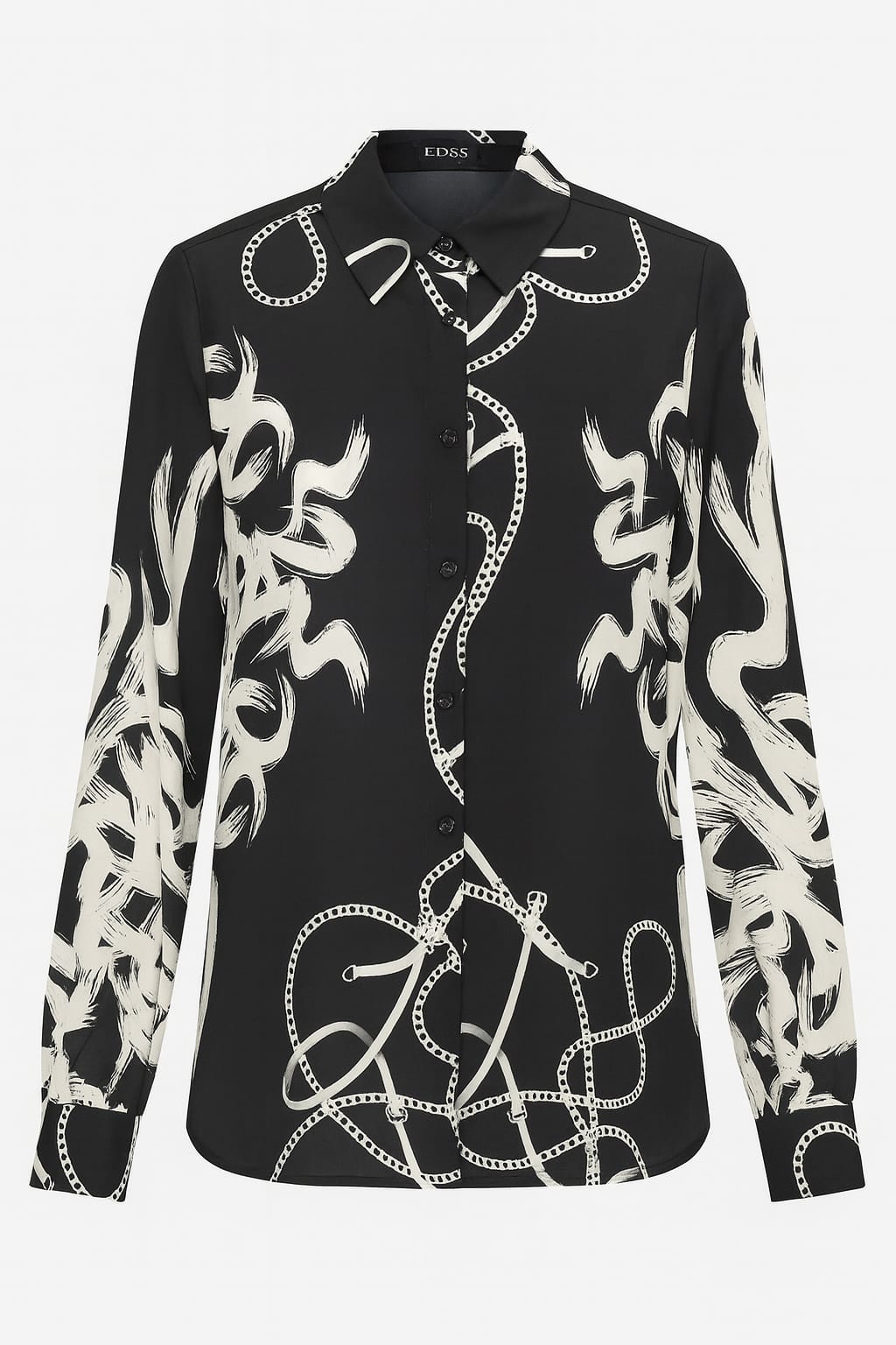 Camicia elegante in tessuto leggero nero con stampa bianca a motivo catene e dettagli grafici. Presenta colletto classico, abbottonatura frontale e maniche lunghe con polsino e bottone. La vestibilità fluida la rende perfetta da indossare sia con look formali che casual chic, donando un tocco sofisticato e moderno.