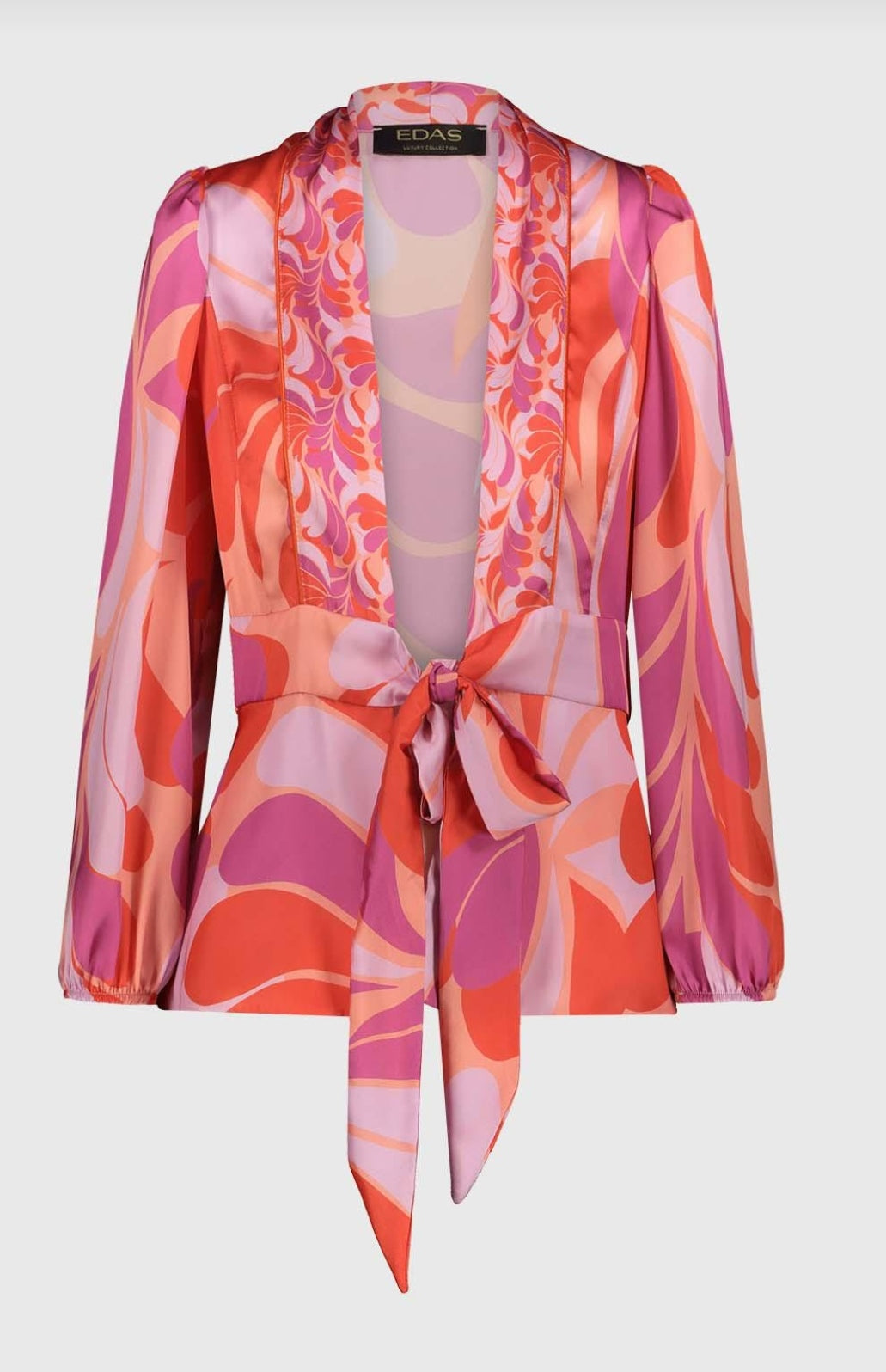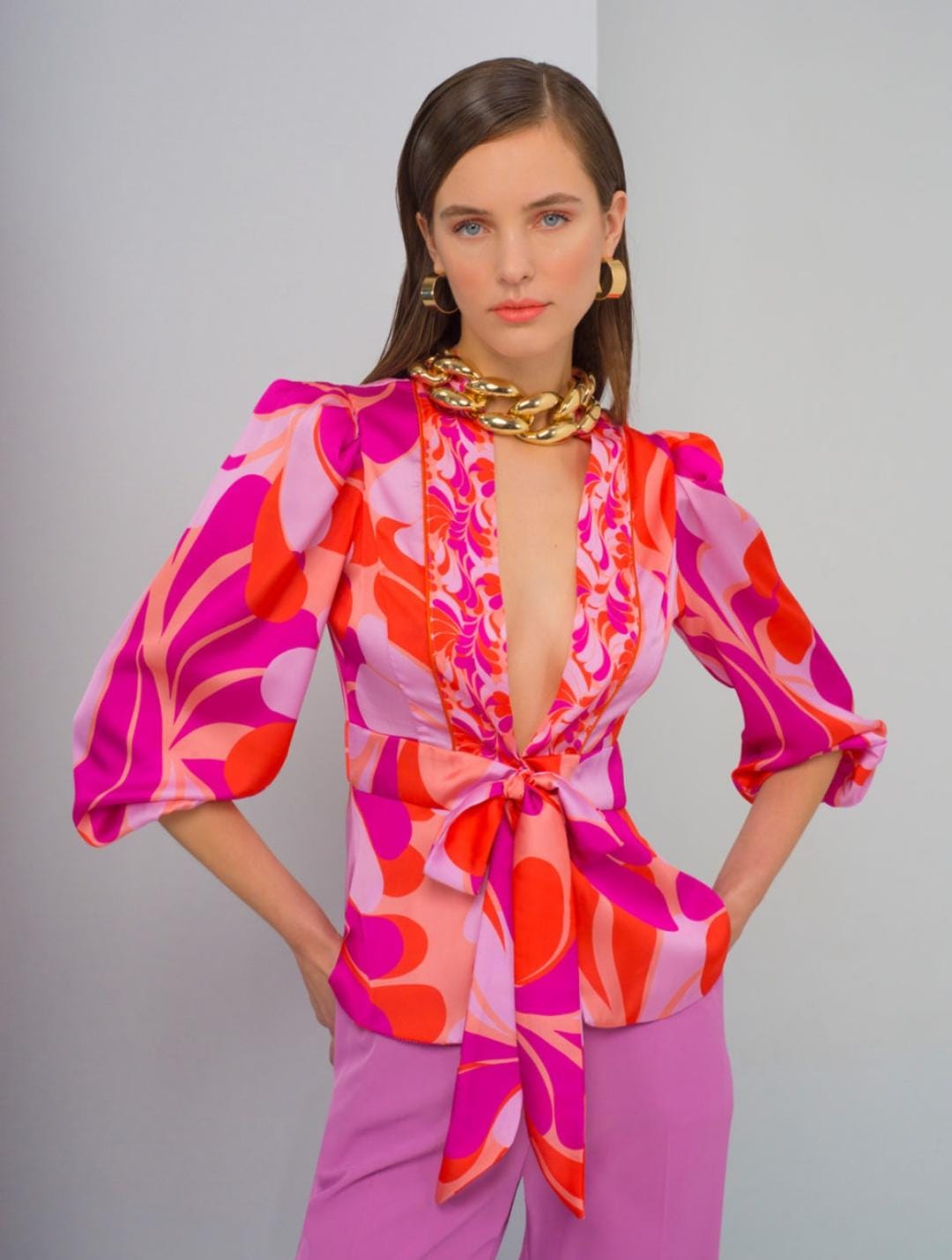 Camicia Giacca con piping sul punto vita. Manica a 3/4 a sbuffo con elastico. Reverse sciallato. Vestibilità regolare.