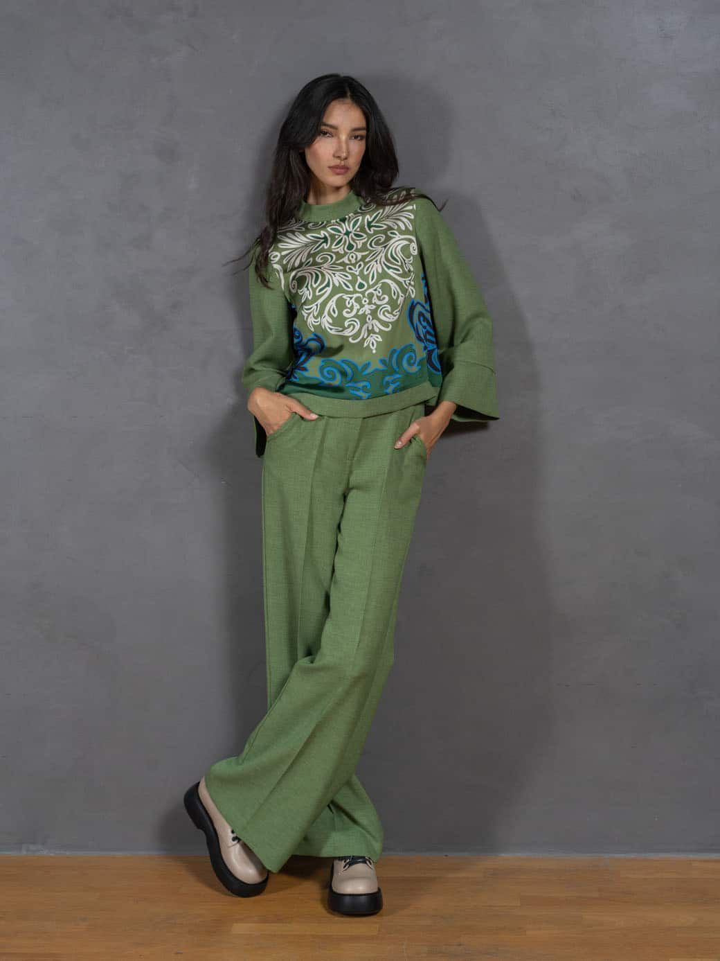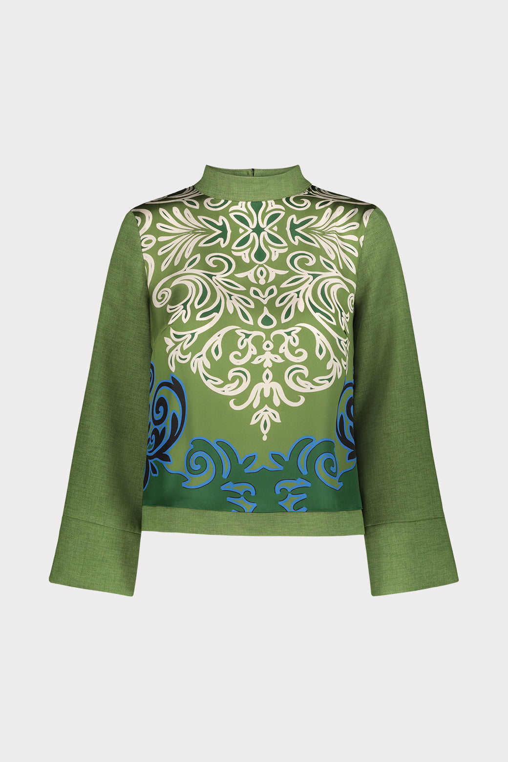 Casacca verde con stampa frontale in raso. Manica lunga a 3/4 modello scampanato. Vestibilità regolare