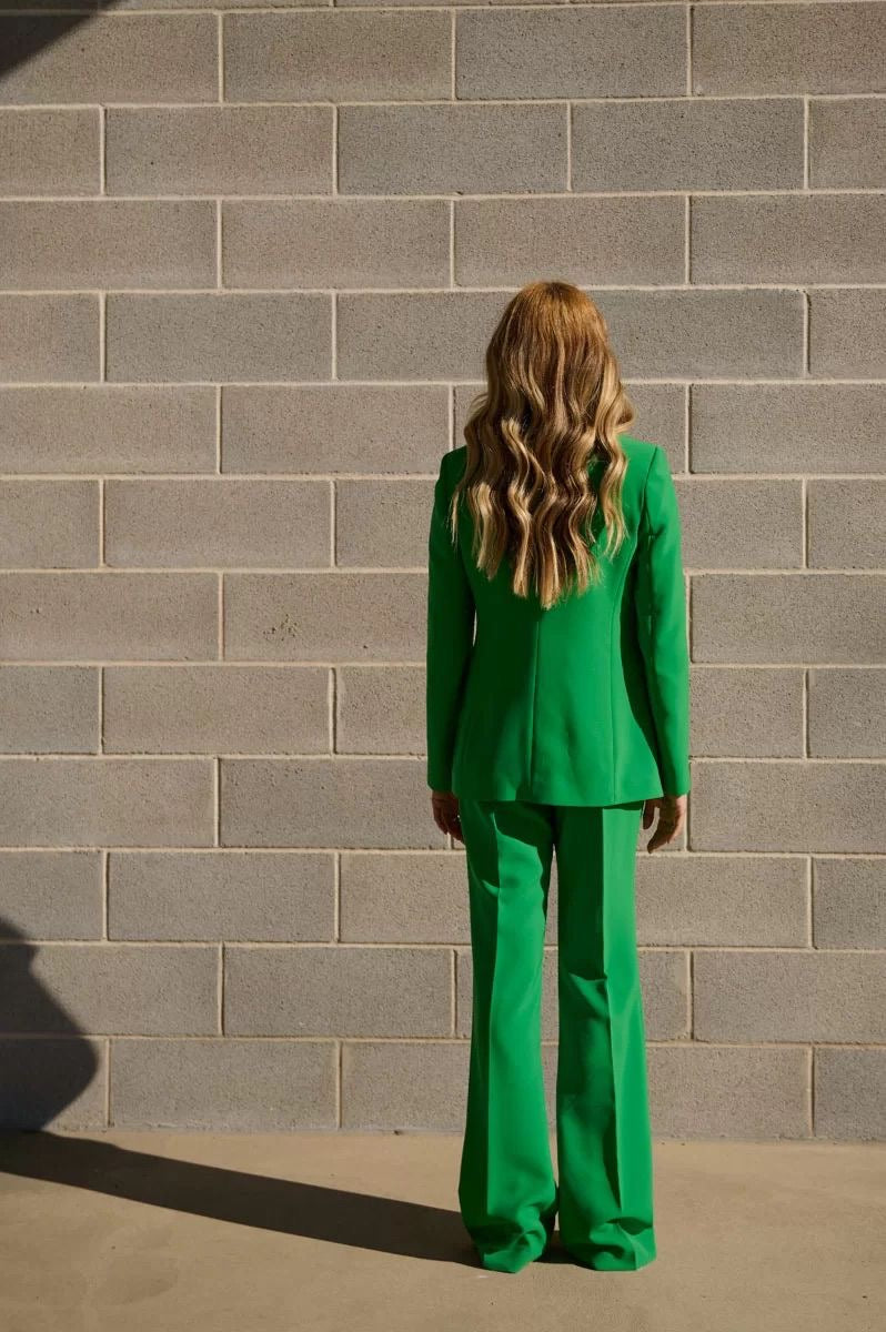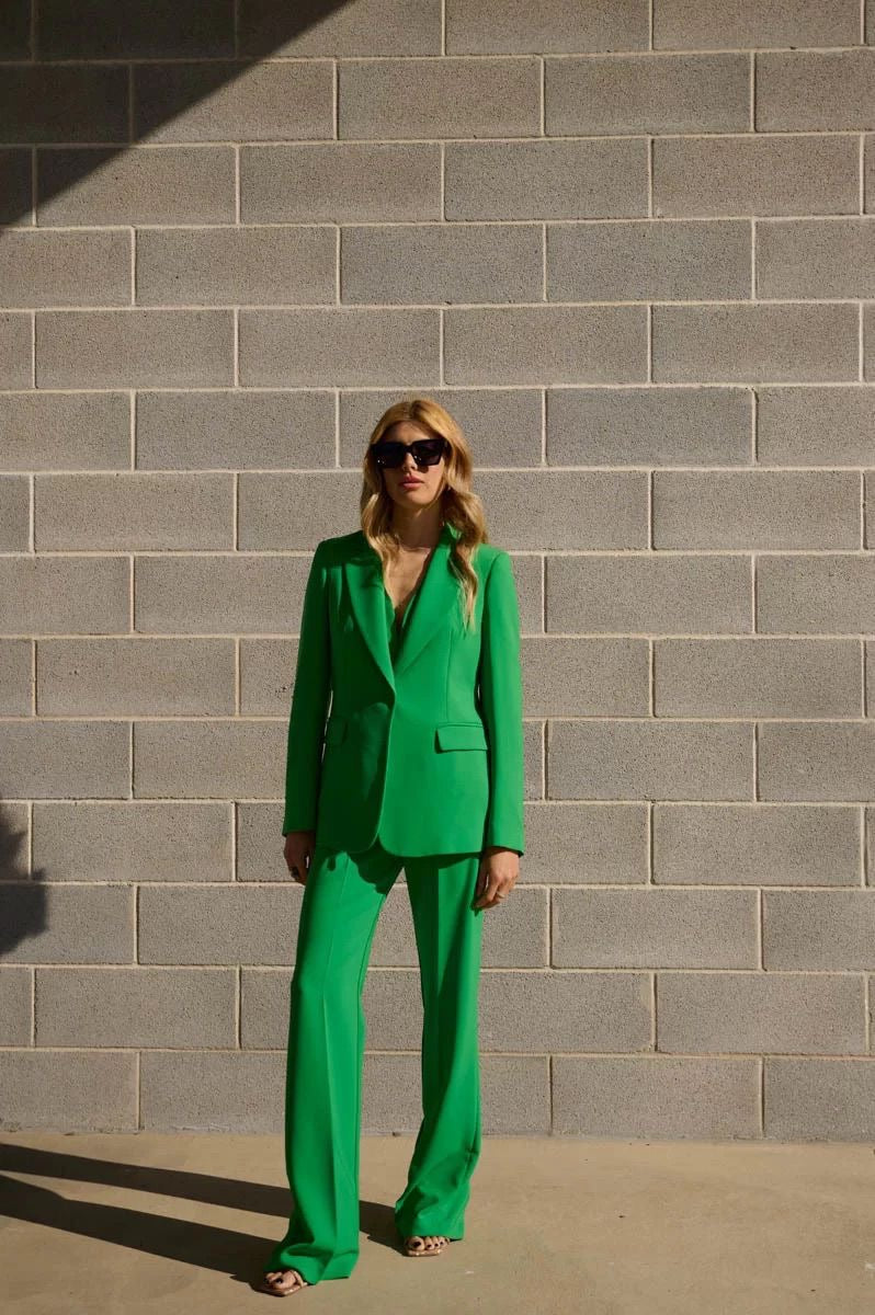 - Blazer verde – monopetto con rever classico, tasche con patta e chiusura con un bottone. Ha una linea leggermente sfiancata che dona una silhouette raffinata ma decisa.
