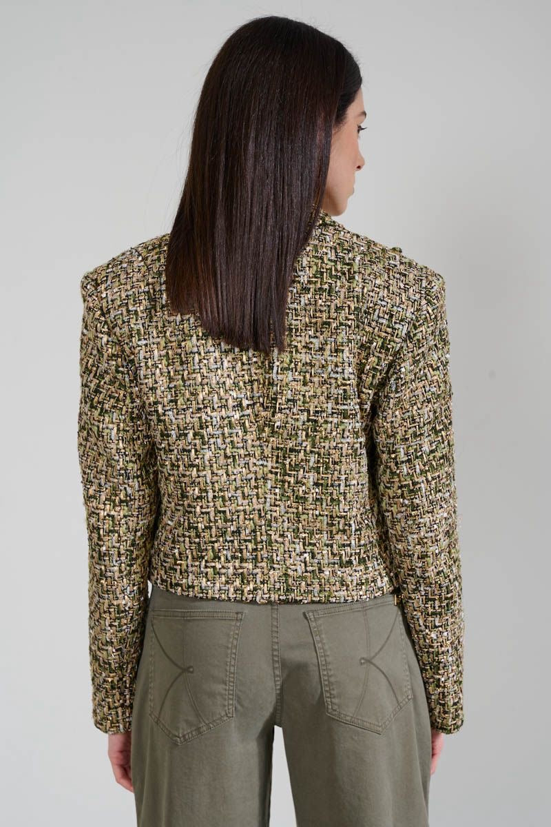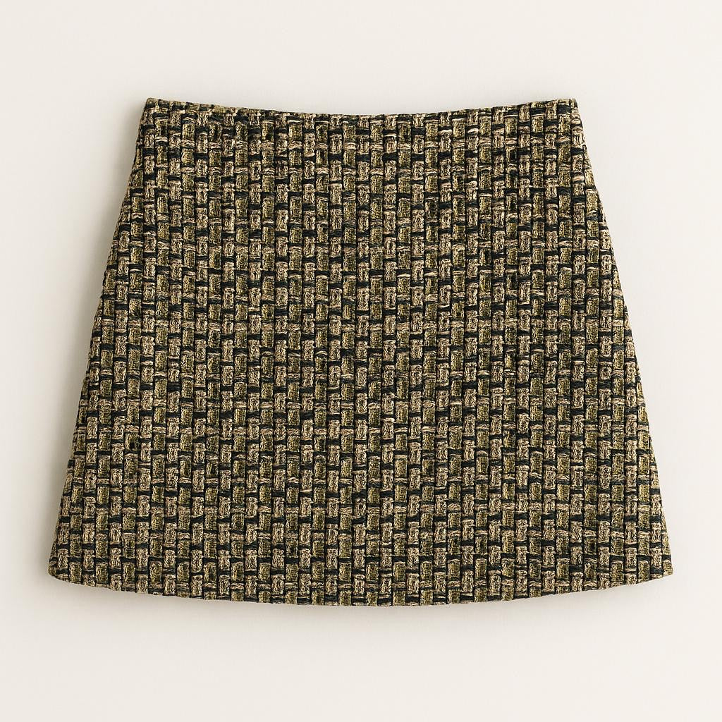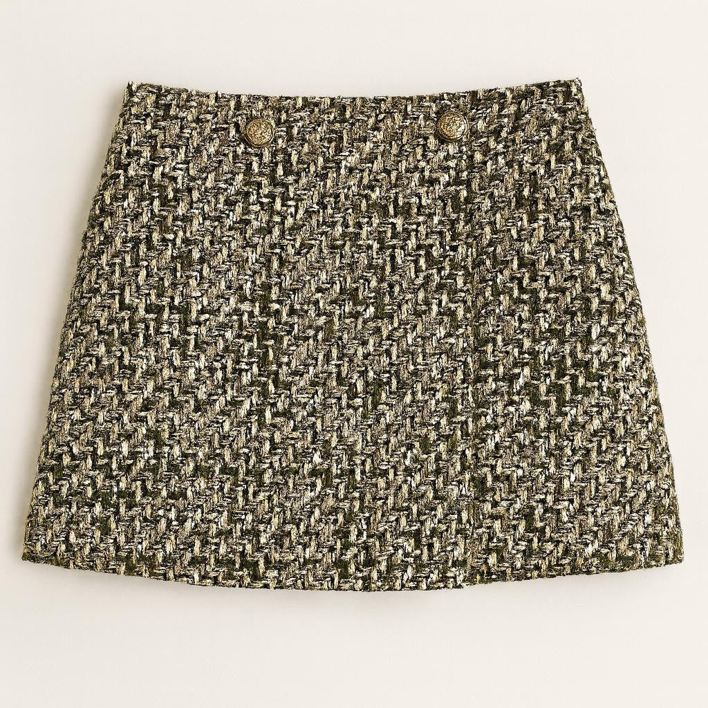 Realizzato in un pregiato tessuto tweed intrecciato nei toni del verde oliva, oro, nero e panna, questo coordinato si distingue per la sua eleganza sofisticata e la cura dei dettagli.
