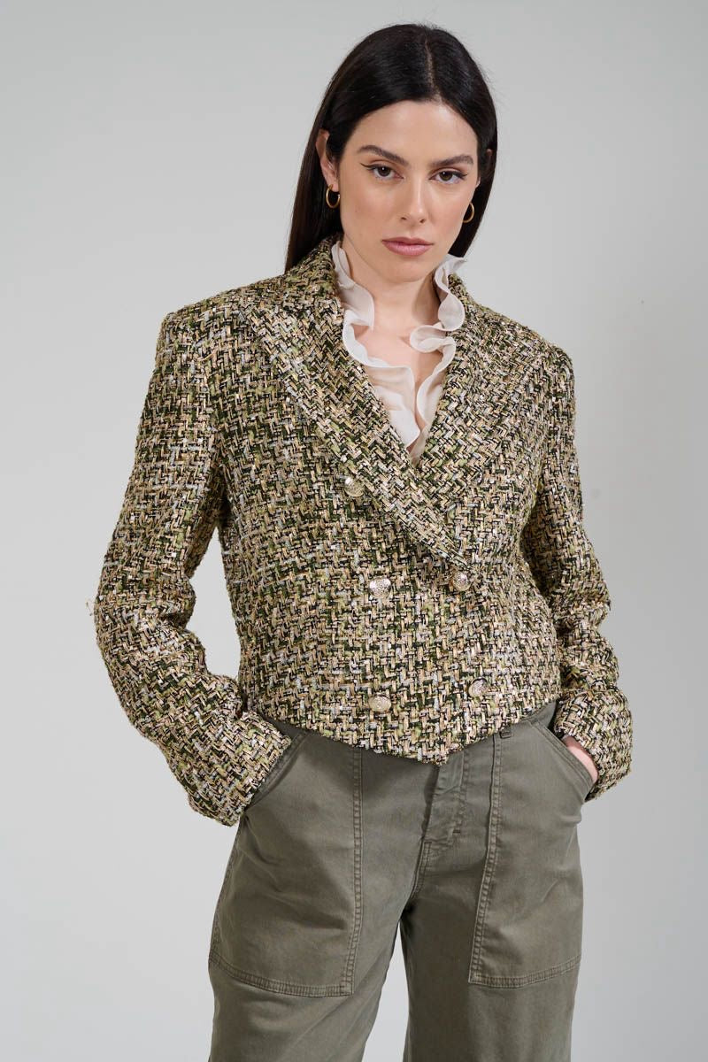 La giacca doppiopetto presenta una linea corta e strutturata, con rever classici e bottoni dorati che valorizzano la texture del tessuto. Le spalle leggermente accennate e la vestibilità sagomata esaltano la figura con un’eleganza moderna.