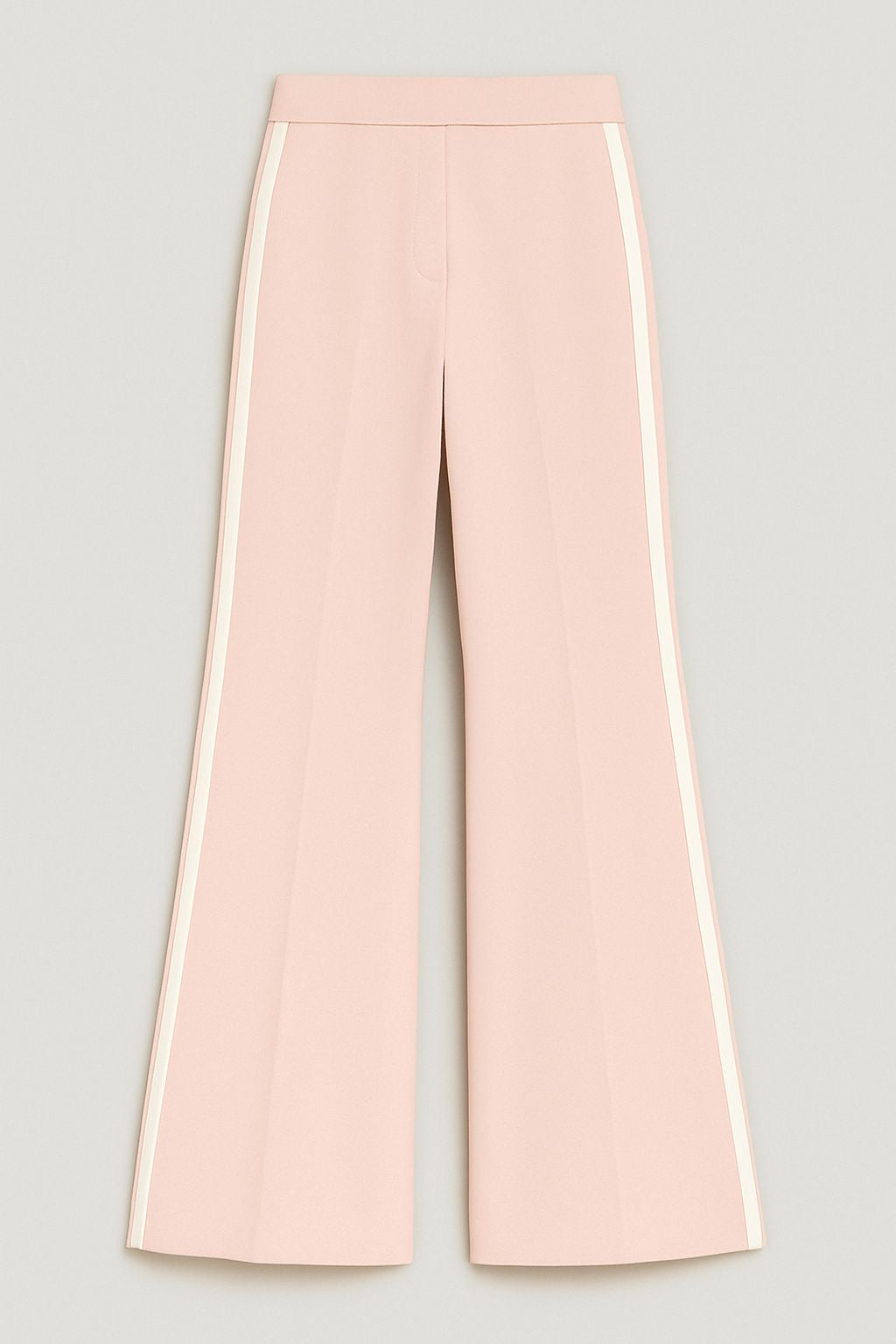Il pantalone completa il look con la sua linea pulita e la gamba svasata. Le bande laterali avorio richiamano i dettagli della giacca e creano un insieme bilanciato e di grande stile. La piega stirata centrale e la chiusura invisibile mantengono un aspetto impeccabile e femminile.