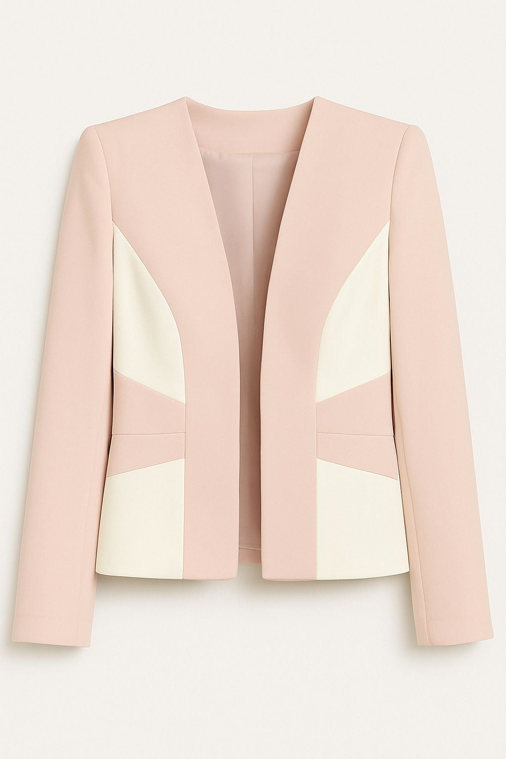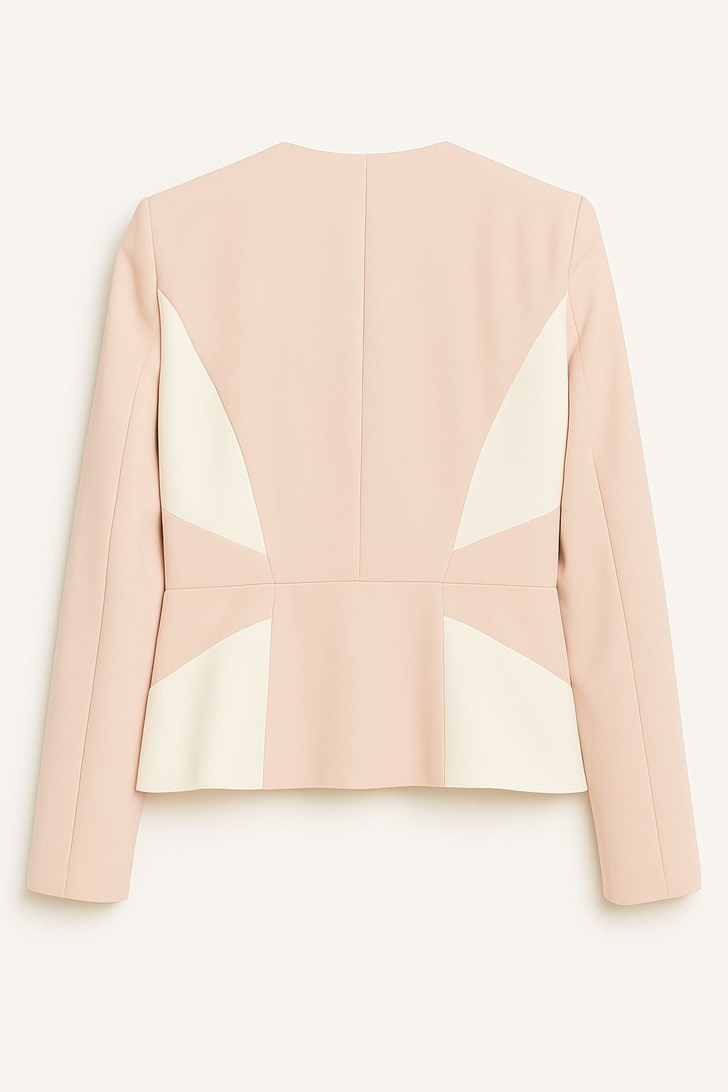 La giacca presenta una silhouette sfiancata con taglio sartoriale, scollo a V senza revers e pannelli geometrici avorio che esaltano la vita e aggiungono un tocco moderno e raffinato. Il design corto valorizza il punto vita e si abbina perfettamente ai pantaloni a vita regolare.