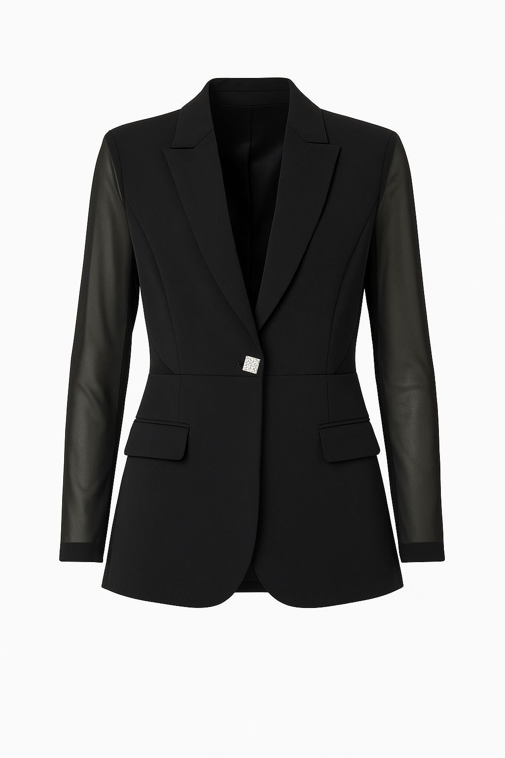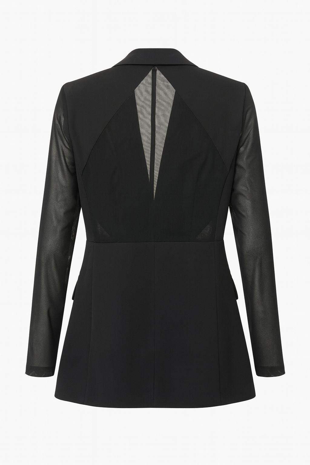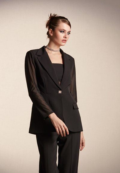 La giacca nera presenta un taglio classico con rever a lancia, chiusura con bottone gioiello, e maniche in tulle trasparente che donano leggerezza e femminilità. Sul retro, un elegante inserto in tulle a triangolo aggiunge un tocco moderno e sensuale.