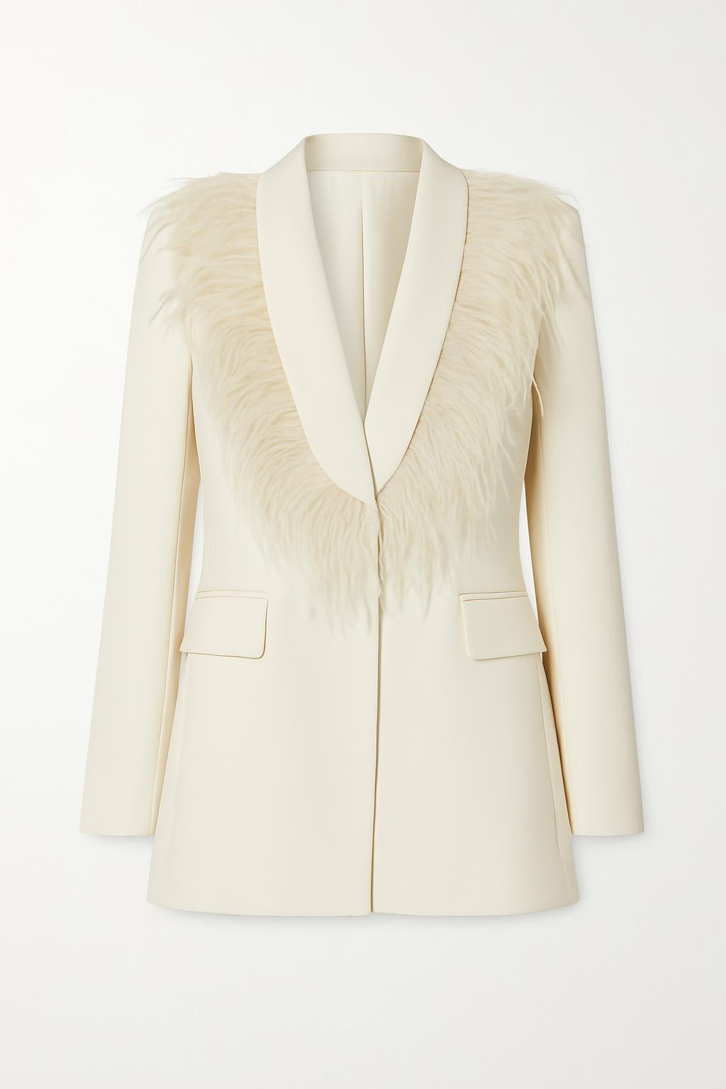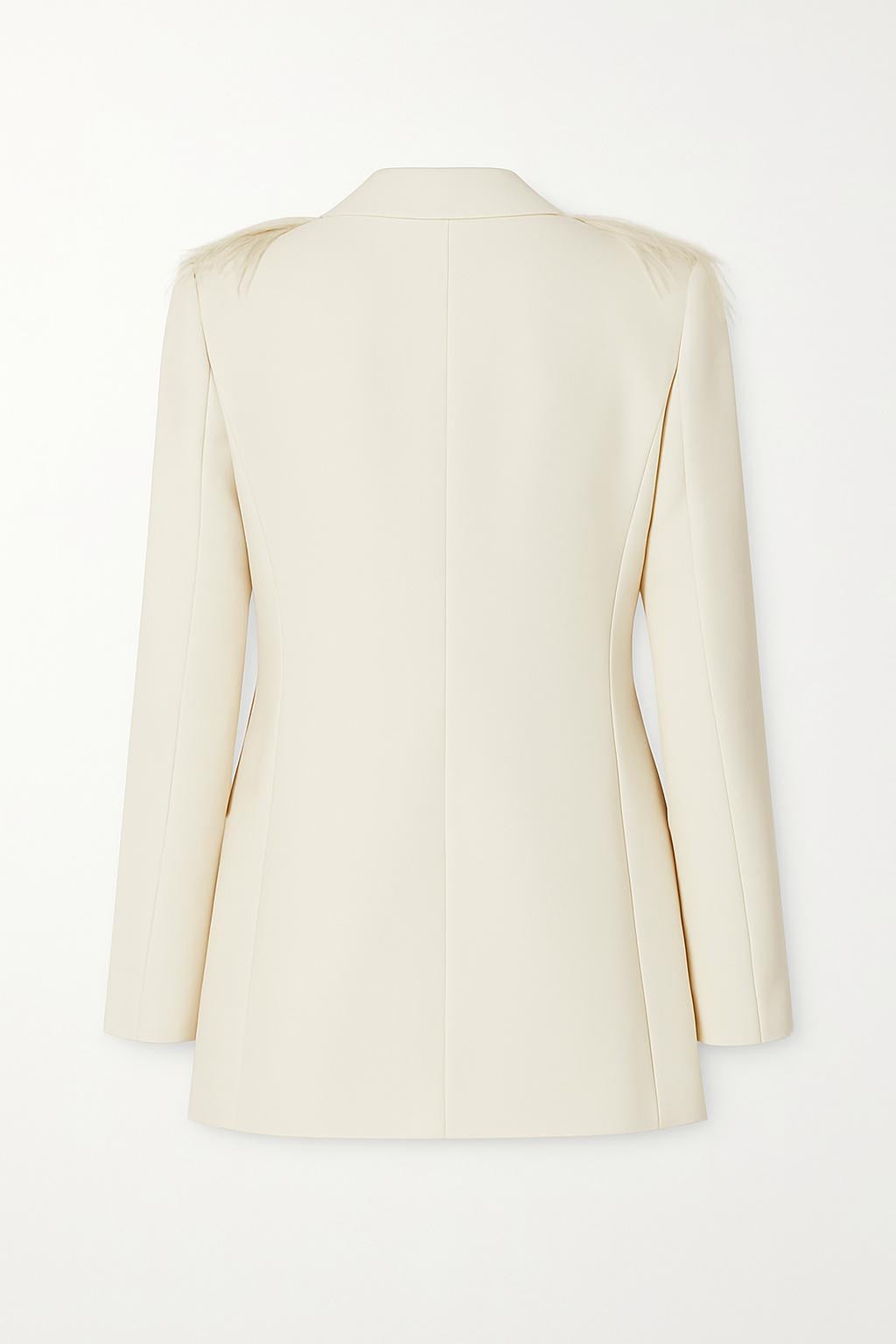 La giacca dal taglio sartoriale presenta un elegante rever sciallato interamente decorato da piume tono su tono, per un effetto luminoso e raffinato. La linea leggermente sfiancata e le tasche a filetto aggiungono equilibrio e modernità.