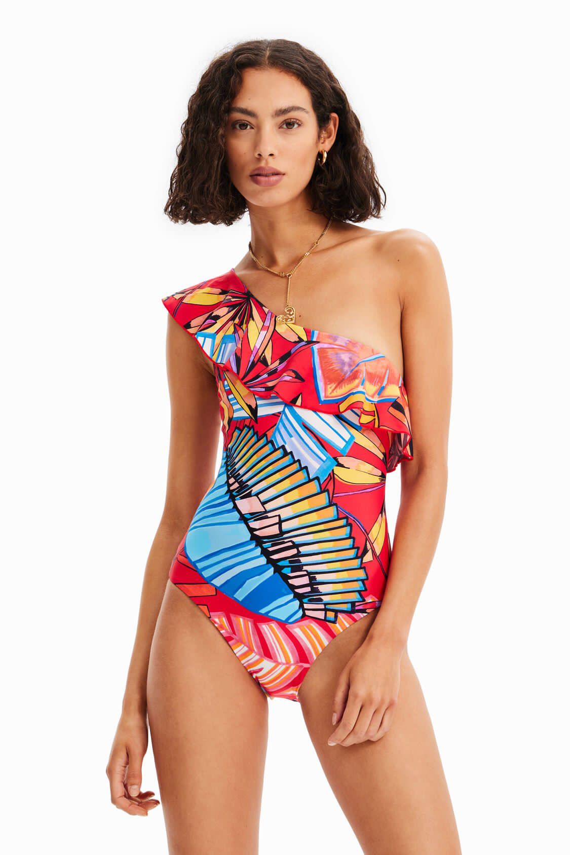 Costume intero, monospalla, della collezione di Desigual. Multicolore con volant sulla spalla, che continua sullo scollo.