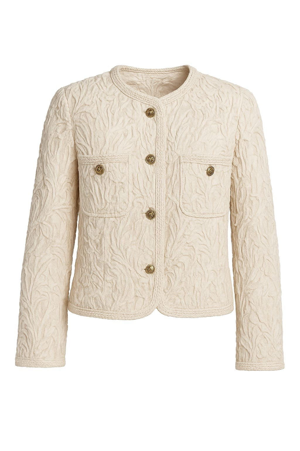 Elegante giacca in tessuto lavorato a rilievo con motivo astratto, caratterizzata da un design senza collo e dettagli sartoriali raffinati. Il modello presenta bottoni dorati decorativi sul davanti e sulle tasche applicate, che donano un tocco di luminosità e stile. Versatile e sofisticata, può essere indossata sia con pantaloni eleganti che con un look casual chic.