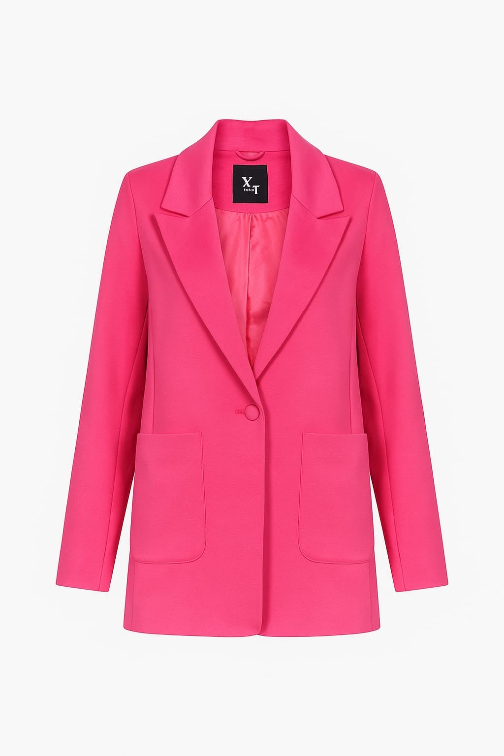 Blazer dal taglio moderno e versatile, caratterizzato da un vivace colore fucsia. Realizzato con tessuto leggero e foderato internamente in satin coordinato, presenta un rever classico, chiusura monopetto con bottone rivestito e due ampie tasche frontali applicate. Linea morbida e femminile, ideale per completare outfit sia casual che eleganti.