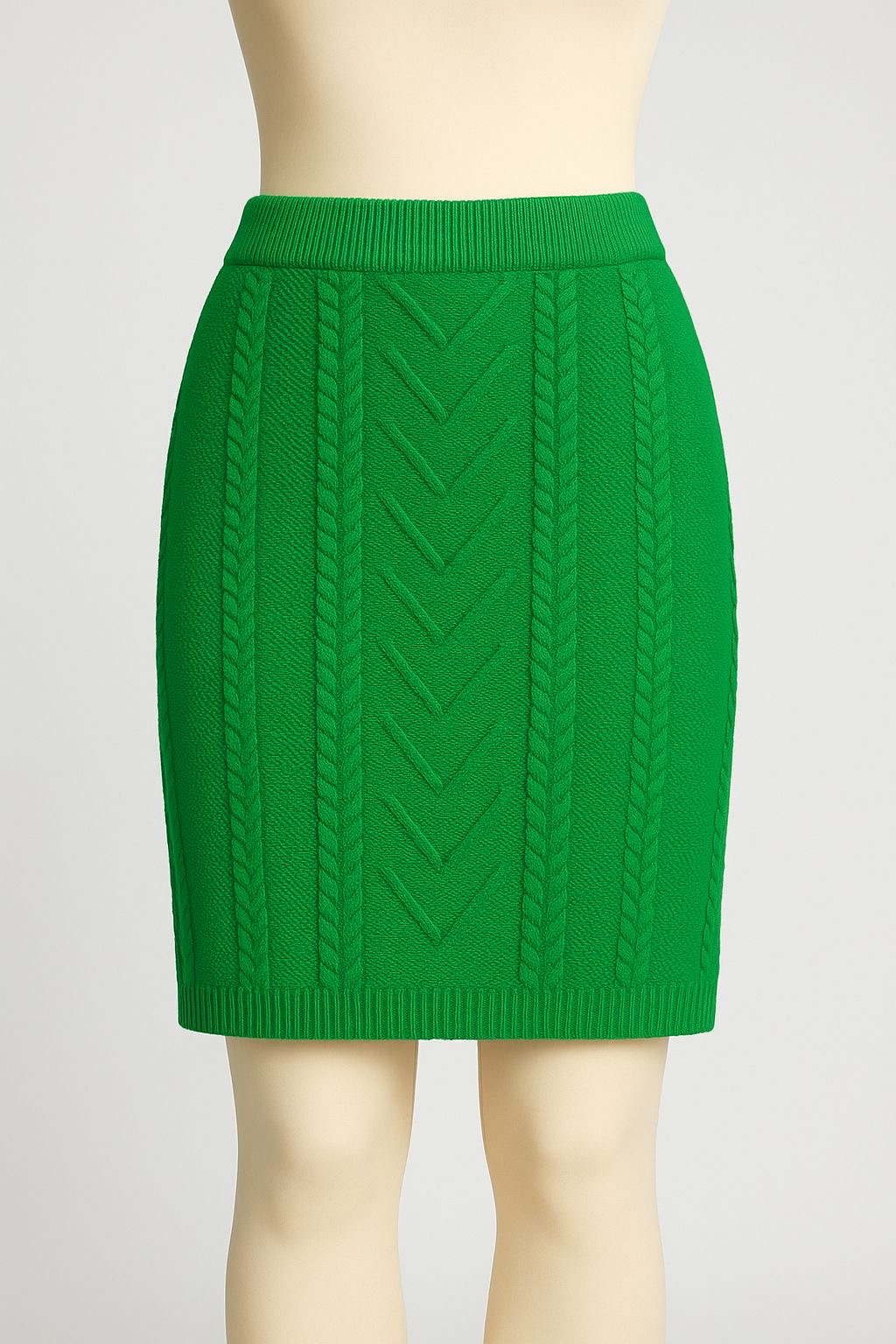 Gonna in maglia a lavorazione intrecciata, realizzata in filato morbido e compatto che valorizza la figura con una vestibilità aderente ma confortevole.