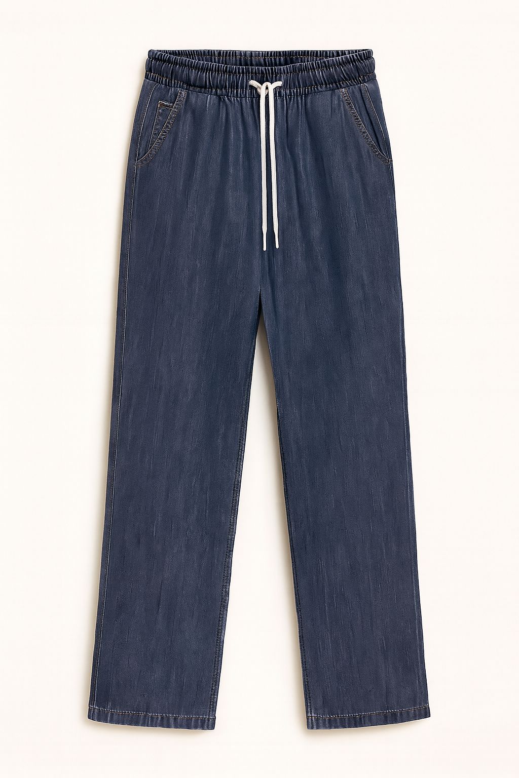Pantalone in leggero denim effetto jogger, caratterizzato da una linea dritta che si restringe leggermente verso il fondo per un look moderno e confortevole.