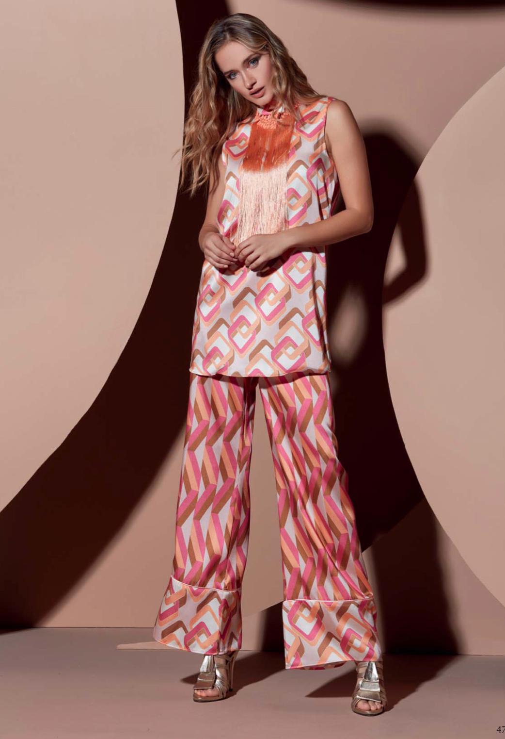 Completo con Blusa e pantalone stampa geometrica nella variante unica. Blusa lunga taglio dritto a giro manica con collo leggermente alto e collana con pietre e frange integrata rimovibile. Pantalone con elastico in vita modello a palazzo.