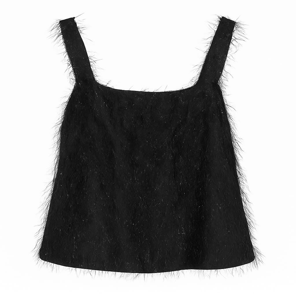 Top in tessuto “eyelash” con fili luminosi. Scollo quadrato, spalline larghe e linea leggermente svasata che cade morbida sui fianchi. Il filato con micro-lamé dona riflessi discreti, perfetto per look da sera o party. Modello senza chiusure, comodo da infilare. Foderato per maggior comfort.