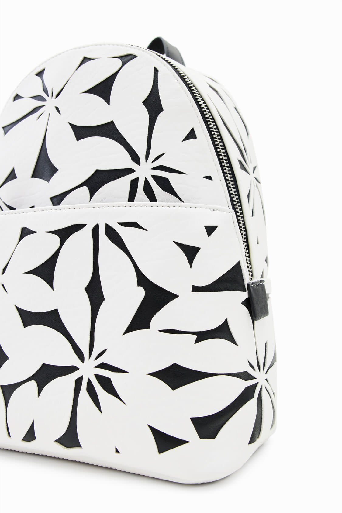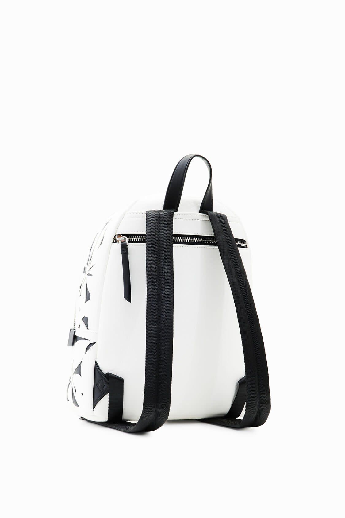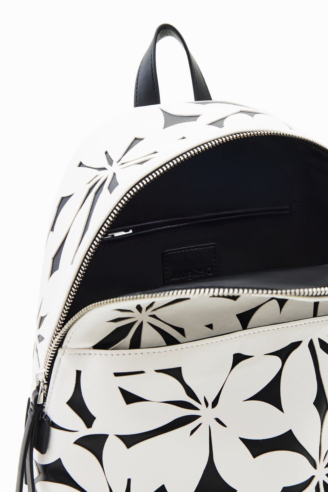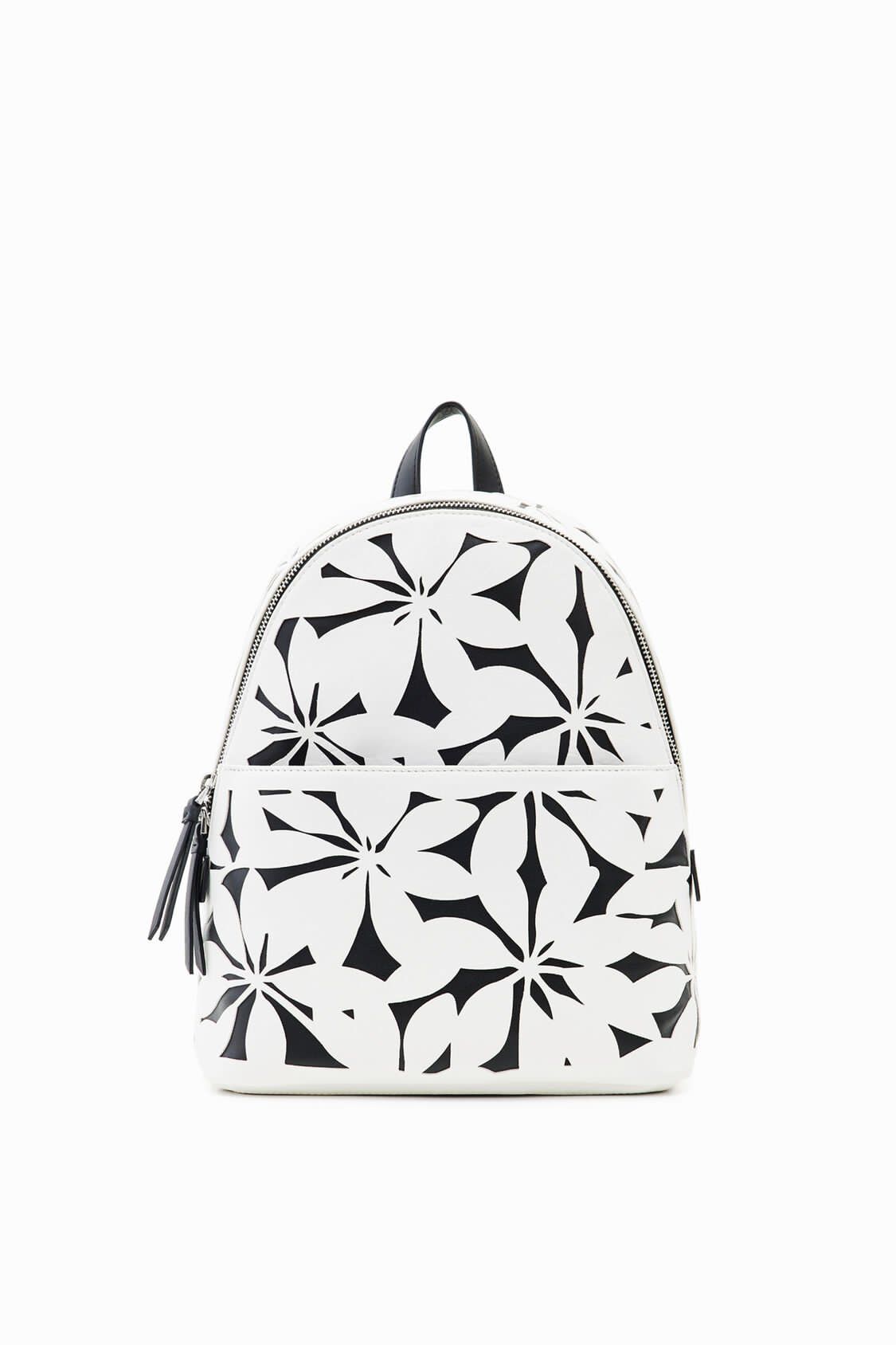 Zaino bianco e nero di Desigual. In tessuto ecopelle all'esterno con disegno fiore fustellato, in rilievo. Vari manici e tasche. Fodera interna 100% Poliestere.